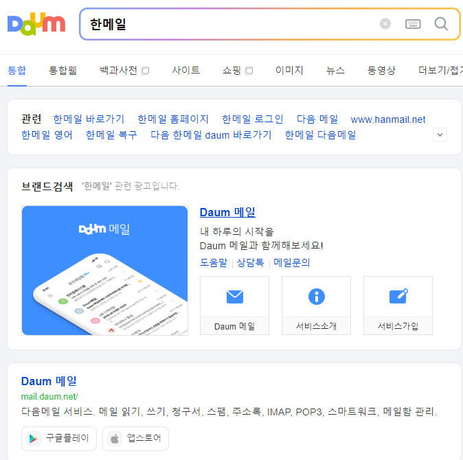 - 한메일을 검색 시 다음 메일이 나오는데 다음 메일을 선택하여 공식홈페이지에 접속을 합니다.