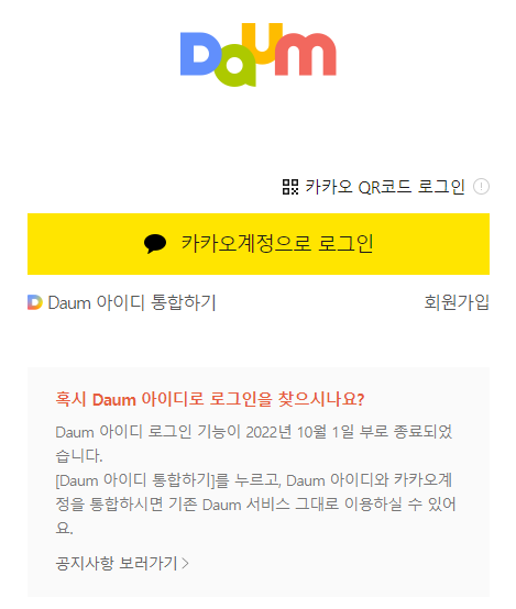 현재는 다음아이디가 2022년 10월 1부로 종료되었기 때문에 다음 아이디 통합하기를 통해서 다음아이디와 카카오계정을 통합하시면 다음 서비스를 그대로 이용해 볼 수 있습니다.