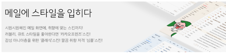 메일에 스타일을 입힐 수 있습니다 이 기능은 메일함을 열었을 때 보이는 디자인을 뜻하며 취향에 맞는 스킨 즉 카카오프렌즈 스킨과 클래식 스킨 심플스킨 중에서 하나를 선택하여 메일함을 이쁘게 디자인할 수 있습니다